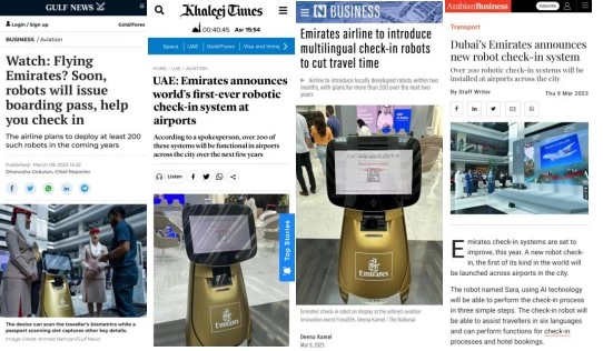 近日,阿联酋航空引入特斯联值机服务机器人,受《海湾新闻》《海湾时报》《国民报》《阿拉伯商报》等阿联酋地区媒体大篇幅报道。该自助值机方案基于泰坦服务机器人的标准化功能进行二次场景化定制,将满足迪拜机场快速值机、路线导航、信息查询等综合服务。阿联酋航空首席运营官Adel Al Redha在接受前述媒体采访时表示:我们是全球第一家引入此类值机机器人的航空公司。