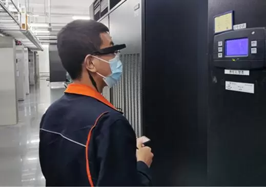 在中国电信北京公司智慧机房内,巡检人员头戴AR眼镜巡视检查,AR眼镜在语音播报设备状况。作业过程中,AR眼镜实时显示设备运行状况,将机房的视频影像及巡检数据信息回传到后方控制中心。