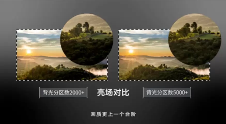 背光分区的意义在于能够实现背光面板中每一个分区独立的亮度控制,从而更好地掌握电视画面中的明暗效果,带来更加优异的视觉体验。从过往技术来看,当电视的背光分区达到数百级时,画质能够达到了行业轻旗舰的水平;当背光分区达到两千级时,就能够超越OLED电视;当背光分区的数量达到5000级以上时,就可以让我们同一幅画面里看到从未发现过的细节。
