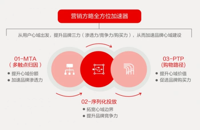 品牌面向精准受众进行营销策略的执行落地,还需要配备相应的科学工具,以加速心域链路流转的效率。通过营销方略的多触点归因MTA、序列化投放、消费购物路径识别PTP三大核心技术,品牌商家可以覆盖营销前中后的全过程,全方位助力商家提升用户运营效率,实现销量增长。