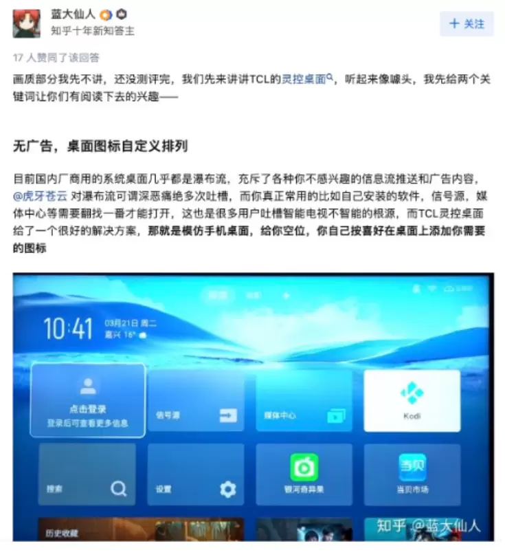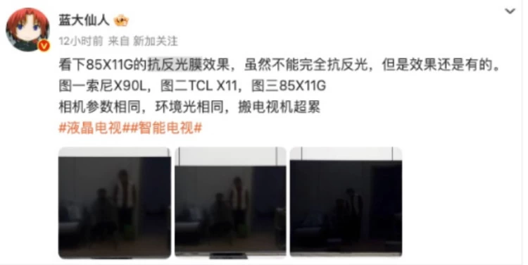 蓝大仙人还在做画质测评,但是对灵控桌面和CEC功能大说特说,尤其是灵控桌面,没有开机广告、支持桌面图标自定义排列、CEC支持外接设备与电视机开关机联动也是国内首家,单单这两点就很值得,此外从蓝大仙人的其他评价来看,TCL X11G的抗反光膜效果也是好过索尼等旗舰电视的。