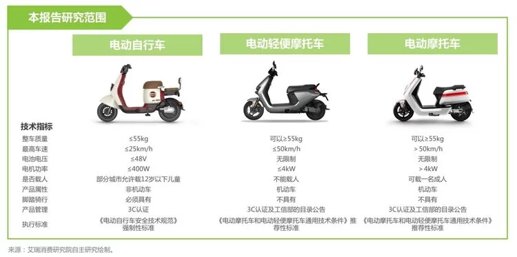 本报告的研究对象包括为符合《电动自行车安全技术规范(GB 17761-2018)》,即“新国标”的电动自行车,与符合《电动摩托车和电动轻便摩托车安全要求(GB 24155-2020)》的电动轻便摩托车和电动摩托车;两轮电动平衡车、两轮电动滑板车不在本报告的研究范围内。
