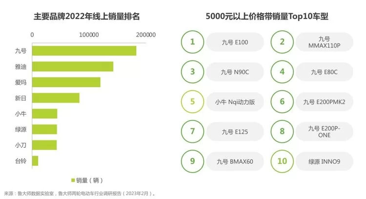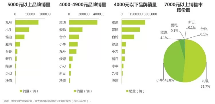 根据鲁大师的线下调研数据显示,4000元级以下产品线中,2022年两轮电动车品牌销量-线下雅迪、爱玛总量大,九号、小牛在高价带销量领先。