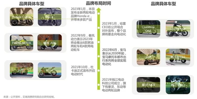 近几年多家摩托车企业开始布局两轮电动车;其中本田在2023年1月发布全新两轮电动品牌Honda e:,并带来多款产品;今年1月哈雷CEO对外宣布,整个品牌将要走向电动化,春风动力在去年表示2023年推出4款两轮电动车;宝马计划从2023年起都市出行系列将全部实现电动化;2021年社卡迪宣布开启电动时代,同年钱江成立钱江电动科技公司。