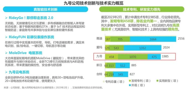 九号定位于创新短交通和机器人领域的科技公司,聚焦创新与智能化赛道,建立“人-车-路-云”多端打通的服务链路和系统迭代机制,开创了两轮电动车行业的智能化新赛道。创造性地打造了"无需钥匙,靠近就解锁"的RidevGo系统全新电驱系统 MoleDrive、全新彩屏仪表操作系统 RideyFUN、全新视觉和体验设计APP6.0,以及打通了功能8:服务可持续OTA升级优化的九号云电系统等。自成立以来,持续成为行业智能化创新的领跑者。