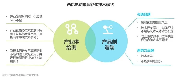 两轮电动车智能化发展仍处于早期阶段,作为新兴产物,无论是核心零部件控制器(MCU)、芯片、智能大屏,还是整车电子电气、软件、操作系统,都广泛处于从其他智能产品、智能汽车领域做技术参考的阶段,传统头部品牌关注重门然大部分集中在续航、性能提升方向,对智能化的投入优先级不够;此外,大多不具备较强的智能化技术、软件研发实力和人才储备,在智能化的技术研发、产业合作上要进行的探索与尝试任重道远。新势力品牌技术领先但市场份额低,对行业整体智能化水平提升有限。