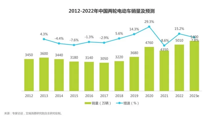 国内市场两轮电动车销量极大的受地方新国标政策的执行力度影响,艾瑞咨询不完全统计与估算,2022年中国两轮电动车销量约5010万辆,较去年增长15.2%,预计2023年销量将达到5400万辆。