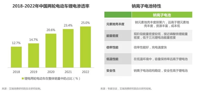 受新能源高需求导致的锂电池价格上涨等问题影响,两轮电动车的锂电池渗透率增长不及预期,2022年锂电池两轮电动车在整体市场中的销量占比约为25%;在长续航和车辆重量的双重影响下,对密度高、容量大、质量小的电池需求会不断增加,未来锂电池渗透率还会有进一步的提升。另一方面,钠离子电池相比锂电池具有抗低温、倍率性能好、资源丰富、价格低的特点,行业内多家公司在努力研发钠离子电池,预计在2023年下半年钠离子电池开始投入市场使用,未来几年将迎来爆发式增长。