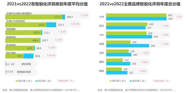 根据鲁大师两轮电动车智能化水平评测结果显示,2022年两轮电动车行业整体智能化水平持续稳定提升;用户系统、车辆交互传输系统评测分值大幅上涨,表明行业整体在智能车机/移动用户系统、第三方设备连接的智能化程度有质的提升。分品牌看,两轮电动车主要品牌的智能化水平得分较2021年提升了约23%,而九号品牌整体智能化水平高于行业平均水平61%,仍保持大幅领先,绿源、哈啰品牌在智能化程度上加速追赶,2022年智能化水平得分分别提高了76%和80%。