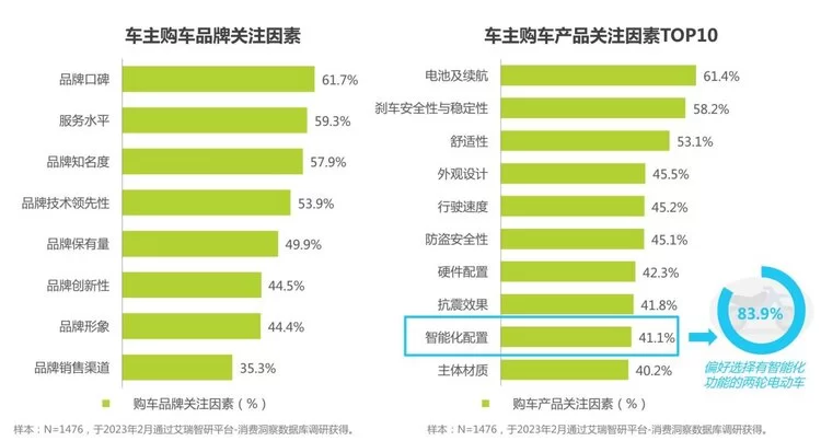 车主购车时更为关注品牌的口碑、服务水平、知名度以及技术领先性。从产品角度,除电池续航、安全性、舒适性外,车主对于智能化的需求也值得重视,83.9%的车主在购车时更偏好购买有智能化功能的两轮电动车。