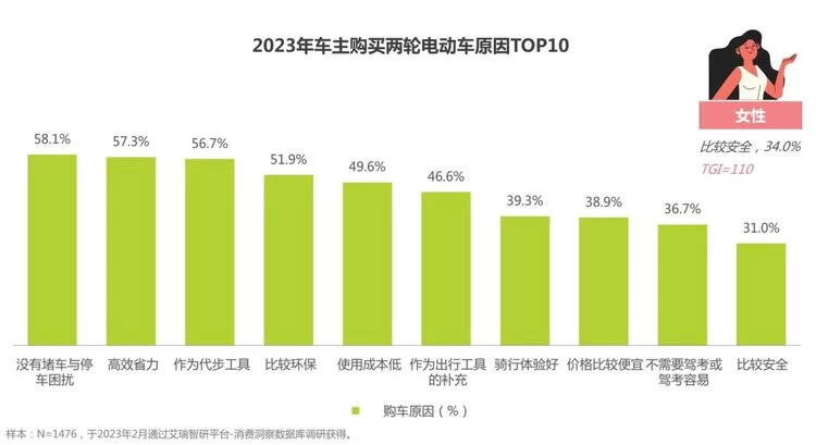 从调研数据上看,没有堵车停车困扰、高效省力以及环保是车主购买两轮电动车的主要原因;其次车主购买两轮电动车的驱动因素还包括使用成本低、不需要驾考等;值得关注的是,女性车主出于安全性需求购车的特征更为突出。
