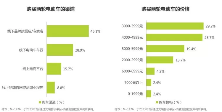 从购车渠道看,品牌旗舰店/专卖店与线下电动车车行为消费者的主要购买场所,而选择线上电商平台(京东、淘宝等)与线上品牌官网或小程序的消费者比例较少;目前仍以线下门店作为主要购车渠道,从购买价格看,3000-5000元的两轮电动车销量仍占据主要销量市场。
