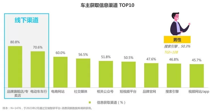 相比于去年各渠道用户占比,今年均有所提升,超6成用户均在线下渠道有过询问和了解相关信息。与此同时,今年线上渠道相比去年有所上升,电商平台成最受欢迎渠道,占比达60.0%。值得关注的是男性用户在两轮电动车信息收集上更偏好较为传统的搜索引擎渠道,更偏好泛信息的获取。