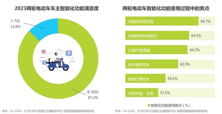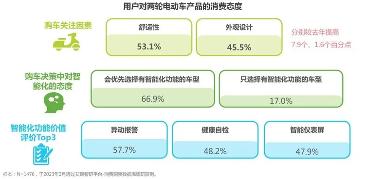 调研发现,用户购车时除关注电池续航、安全性因素外,对于车辆的舒适性、外观的需求也进一步提升。数据显示,83.9%的车主在购车时更偏好购买有智能化功能的两轮电动车,且对于异动报警、健康自检等安全保障类智能化功能的价值认可度更高。
