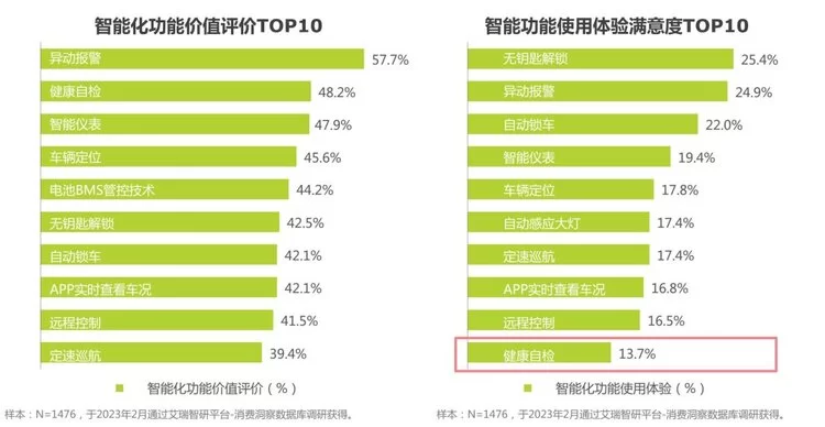 从用户智能化功能价值评价来看,异动报警、健康自检等安全保障类功能价值认可度更高。从智能功能使用体验来看,无钥匙解锁、异动报警、自动锁车等满足用户的便捷性需求的功能体验感更好。值得注意的是,"健康自检"功能在用户认知中价值颇高(宣传到位),而实际使用体验较差(虚假自检),未来需要着重进行优化。