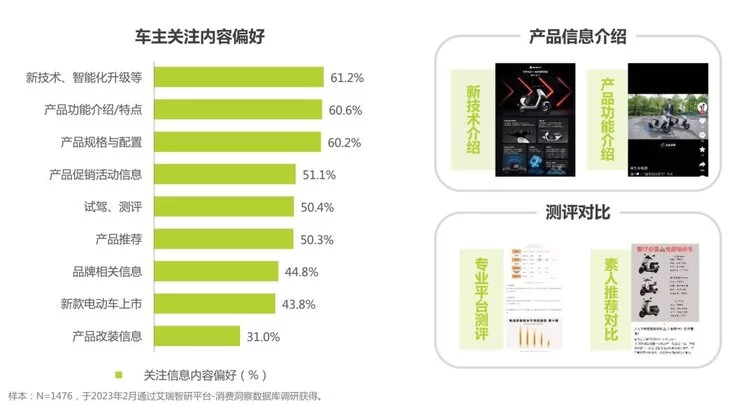 从调研数据看出,超6成车主在搜集信息时,会关注新技术、智能化升级、产品功能介绍、产品规格配置等相关信息,信息形式包括视频类、图文类、互动类等多种形式。