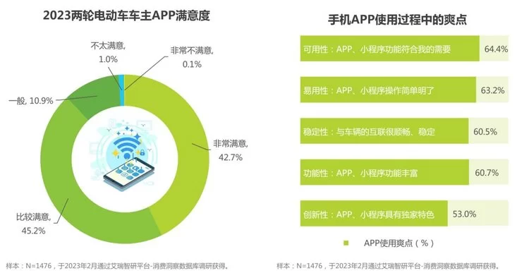 手机与两轮电动车互联,是两轮电动车的智能化显性表现。目前用户对于APP功能满意度较高,主要体现在APP的可用性、易用性,由此,未来APP功能优化重点方向将强调品牌的创新性,功能的丰富性以及平台使用稳定性,以进一步提高用户整体用车体验,强化品牌忠诚度。
