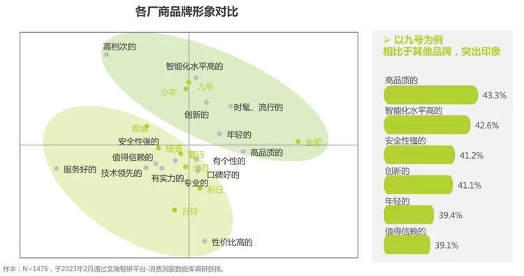 对于消费者来说,雅迪、爱玛等传统品牌形象接近,主要是值得信赖的、安全感强的。而九号、小牛等新兴品牌的突出品牌形象是智能化水平高的、创新的、高档次的,与传统品牌形象截然不同。以九号为代表,高品质的、智能化水平高等是其突出特征。