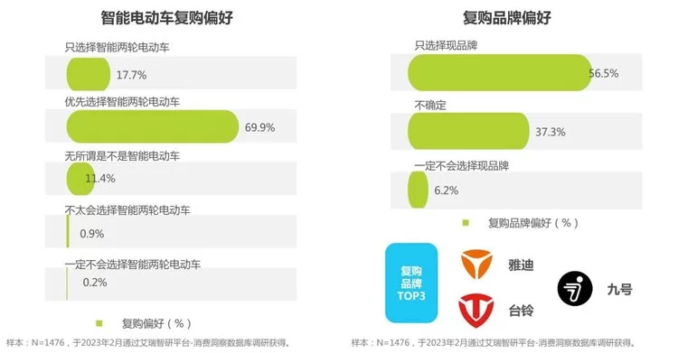 从调研数据上看,近9成消费者会选择在下一次购车时只选择或优先选择智能电动车,说明现有智能电动车用户使用体验满意度高,对智能化功能依赖度强。而对于下一次购车的品牌选择上,56.5%的用户表示一定会购买现有品牌;其中雅迪、台铃和九号用户选择购买现品牌复购的用户占比前三,车主对品牌忠诚度更高。