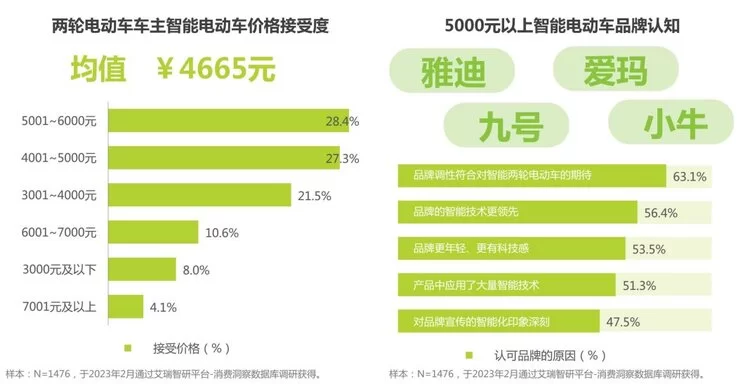 从调研数据上看,车主接受智能电动车价格集中在4001-6000元之间,占比达55.7%,均值为4665元,远高于传统两轮车的购买车价。当提及5000元以上智能电动车品牌时,传统品牌雅迪、爱玛,新生品牌九号和小牛是排名前四的品牌。认可品牌的原因主要是品牌符合车主对智能两轮电动车的调性认知和智能技术更领先。