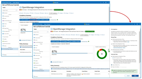 为了使不合规的策略重新与经戴尔工程部门检验的最佳实践回归一致,我们的 Dell HCP 策略修复功能与WAC相集成(暂时是独一无二的),有助于修复任何不合规状况。用户只需点击“Fix Compliance”( 修复合规状态)即可完成修复。