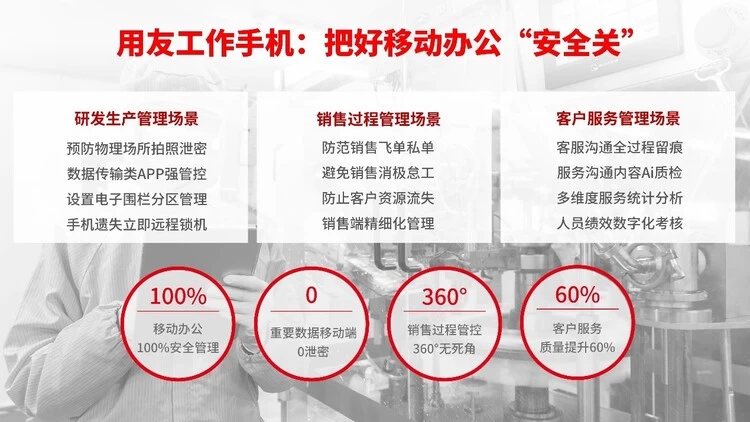 在移动工作场景方面,用友工作手机通过对软件、硬件和通信的深度融合,帮助企业解决重要数据外泄、核心物理区域拍照泄密、销售私单飞单、客户资源流失和客户服务质量低等问题,助力管理者提升掌控力,缓解企业运营管理焦虑,实现事前有防范、事中有保障、事后有处置的全生命周期安全防护,打造移动化、智能化保障平台。