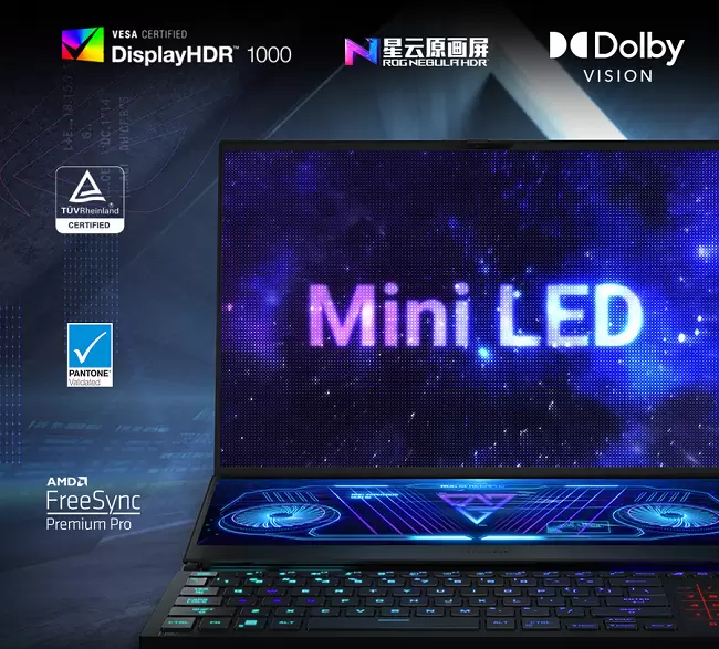 ROG冰刃7双屏搭载了由Mini LED技术打造的16英寸ROG星云原画屏,相比上一代产品,背光分区数量提升至1024个,可减少25%光晕,且拥有11000Hz超高频调光。其刷新率高达240Hz,延时低至3ms,分辨率达到2560×1600,16:10黄金比例设计,峰值亮度达1100尼特,通过HDR 1000与杜比视界认证。本次ROG还在100% P3影院级广色域的基础上加入了原生、sRGB、DCI-P3、Display P3四种专业色域切换,且通过潘通色彩认证,无论何种场景都能提供精准色彩显示。不仅如此,这块星云原画屏更获得了莱茵TüV低蓝光护眼认证,支持AMD Free Sync技术,全方位展现出好屏标杆的实力。