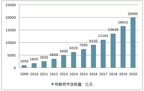 按产业链层级划分,将物联网产业分为支撑层、感知层、传输层、平台层,以及应用层五个层级。数据显示,2014年我国物联网产业规模达到了6320亿元人民币,同比增长22.6%,2015年产业规模达到7500亿元人民币,同比增长29.3%。预计到2020年,中国物联网的整体规模将达到2万亿元。