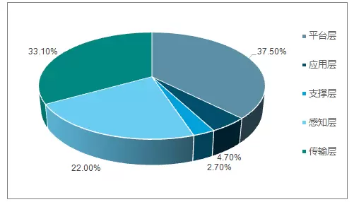 移动互联向万物互联的扩展浪潮,将使我国创造出相比于互联网更大的市场空间和产业机遇。广东省占比超过40%,其中支撑层、感知层、传输层、平台层,以及应用层分别占比2.7%、22.0%、33.1%、37.5%和4.7%。而物联网感知层、传输层参与厂商众多,成为产业中竞争最为激烈的领域。