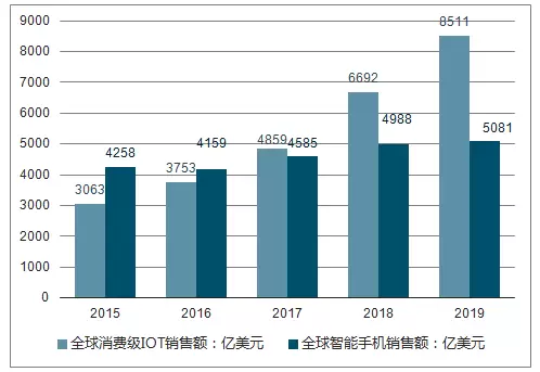 全球消费级 IOT 和智能手机销售额的对比(单位:亿美元)