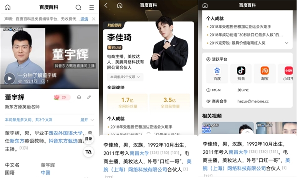 左图为百度百科个人词条页面,中、右图为「我的百科」个人词条页面