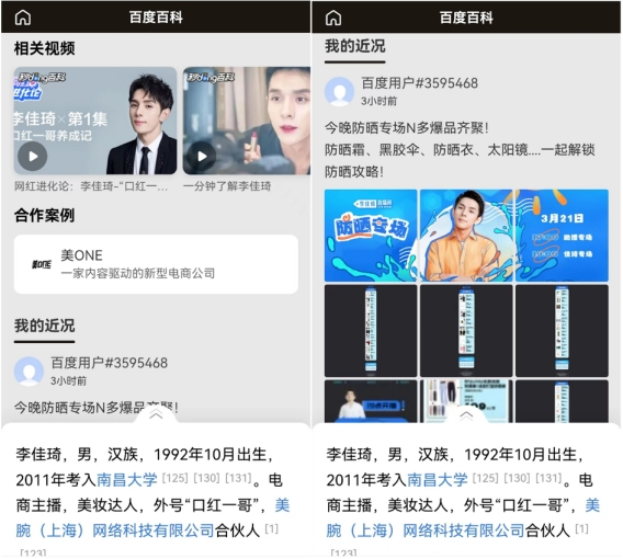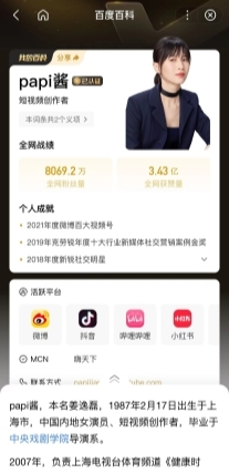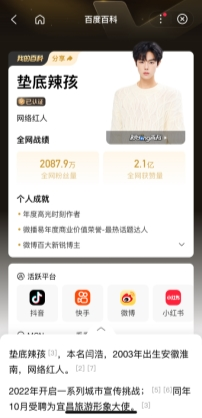 「我的百科」个人专属词条内容具有强聚合性,除了展示全网战绩,还有个人成就、活跃平台、机构、商务联系方式、合作案例、我的近况等信息。其中,活跃平台支持一键链接至创作者各平台主页,打通了从百度到内容平台的流量通路,方便用户进行浏览、访问、互动等。