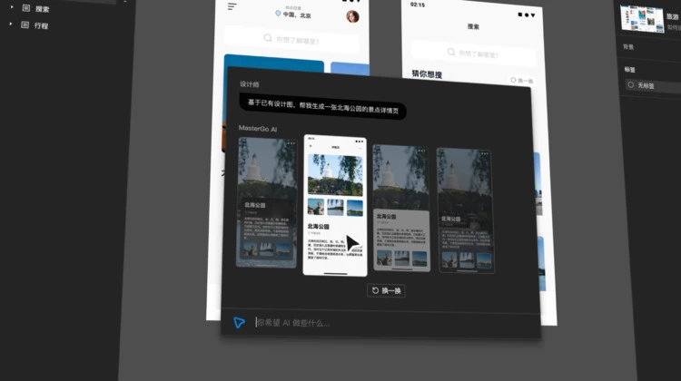 在数字界面设计的创作环节,MasterGo AI 将可以根据现有界面的设计风格,快速生成新的界面。设计师们无需从零开始,只需选择符合需求的页面风格,AI 即可自动生成与原设计风格相符的全新界面,不仅如此,AI 还可以满足个性化的业务需求,大大减轻了设计师的工作负担。