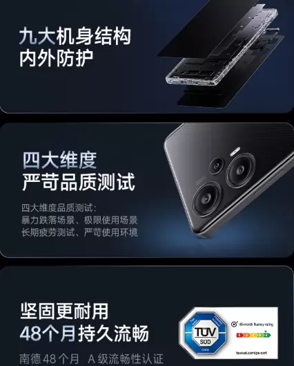 Redmi Note 12 Turbo还保持了小金刚品质,通过4大维度品质测试,拥有9项全面结构防护,支持48个月久用不卡。此外,Redmi Note 12 Turbo搭载5000mAh电池,续航无忧;立体双扬声器、X轴线性马达、红外遥控功能一样不少。