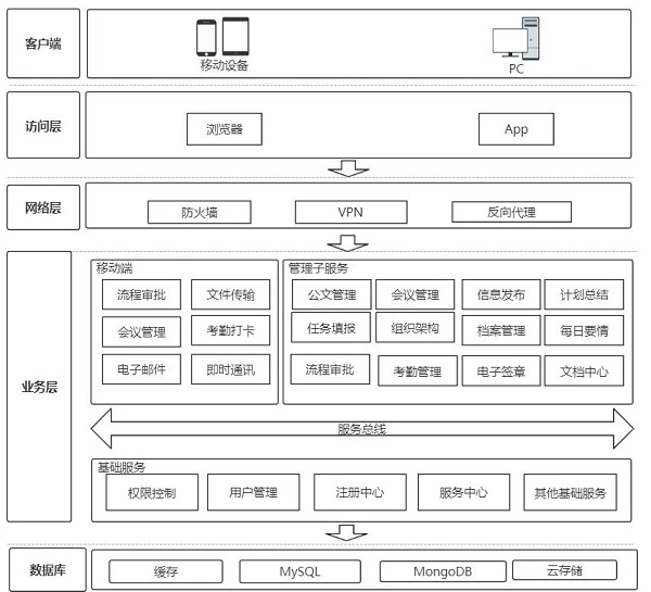 上图是一个OA系统的基础框架,可以看到这里将整个框架分为了五层。想要部署一个OA系统需要的服务有很多,比如业务层包含多个小系统需要多个服务器,数据库层需要缓存服务器、MySQL数据库、文件存储等,网络层也需要防火墙、VPN、反向代理。