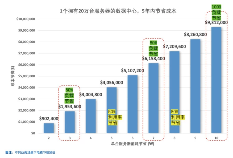 • 如果只有80%的服务器满载,累计可以节省721万美元以上。