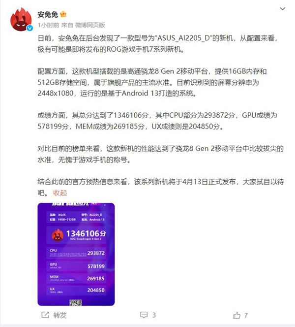 此前ROG游戏手机官方宣布,将于4月13日20:00正式推出全新的腾讯ROG游戏手机7系列,一时间引发了众多玩家的热议。作为全新一代旗舰游戏手机,此次新品的配置势必也将秉持ROG一贯的“高能”基因,3月29日安兔兔官方放出了神秘机型跑分,达到了1346106分,在一众骁龙8Gen 2新机中属于拔尖水准,从产品推测,大概率为最新的腾讯ROG游戏手机7。