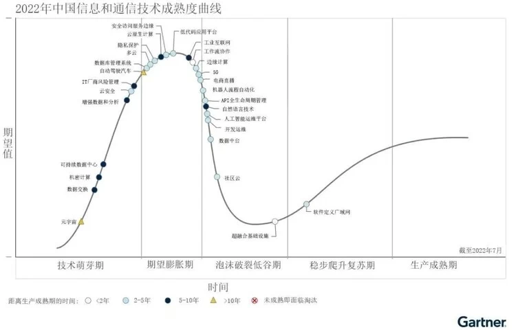 根据IDC咨询的预测,未来几年,边缘算力的投资增速将远快于核心位置,到2025年,全球边缘计算服务器占总体服务器支出比重将从14.4%升至24.9%。Gartner发布的《2022年中国信息和通信技术成熟度曲线》报告亦指出,随着越来越多的企业对风险下降程度感到满意,边缘计算已进入快速增长阶段。
