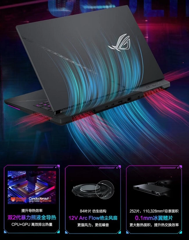 为充分释放处理器和显卡性能,魔霸7 Plus超能版用上了冰川散热架构2.0增强版,其拥有双84叶片绝尘风扇、定制大面积均温板以及薄至0.1mm的冰翼鳍片,带来更强的风力以及热交换效率,配合四出风口设计,能在极短时间内横扫内部热量,实现“冷静”运行。CPU及GPU表面还覆盖有暴力熊Conductonaut extreme二代液态金属,相比传统硅脂导热性更好,能使CPU至高降温15℃,整机性能释放可达240W(手动模式),同时支持ROG智能降噪技术,负载较低时可自动关闭风扇以实现无噪音运行,带来静谧用机体验。