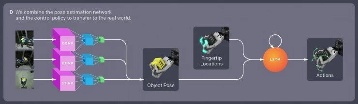 「控制」与「观察」两个独立的网络互相配合,控制网络可以根据给定的物体位姿重新调整它的位姿,视觉网络根据摄像头采集的画面确认物体当前的实际位姿。Dactyl 就这样通过观察控制了手里的物体。