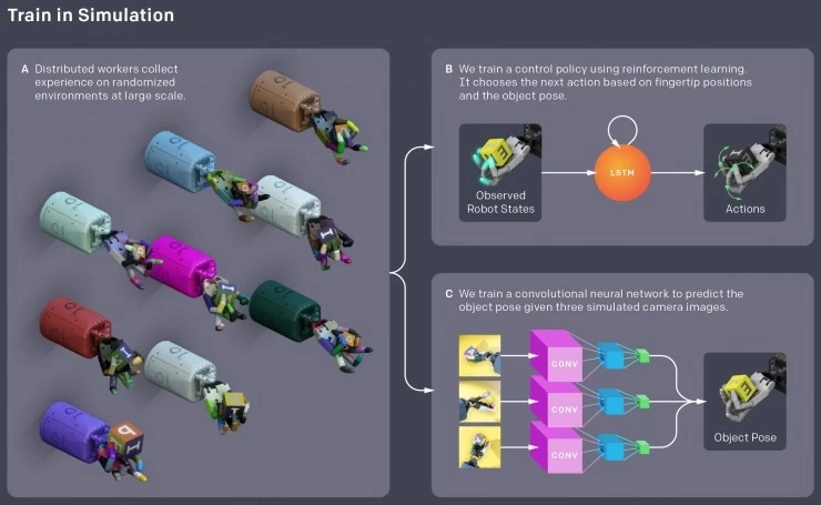 系统设计示意图 - 模拟环境中训练A. 分布式工作站从大量随机环境中收集经验B. 通过强化学习训练控制策略。这个策略根据物体的位姿和五个手指指尖的位置选择接下来的行动C. 训练一个 CNN 根据三路模拟环境中的摄像头画面估计物体的位姿