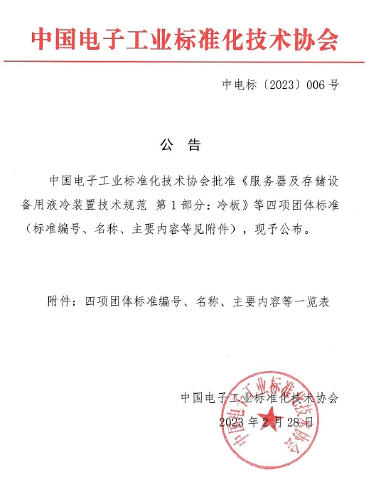 2023年2月28日,《服务器及存储用液冷部件技术规范第1部分:冷板》团体标准在中国电子工业标准化技术协会开放计算标准工作委员会(OCTC)正式发布。此标准由浪潮信息牵头,联合英特尔、中国电子技术标准化研究院等二十家相关单位参编完成。