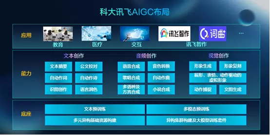 关于“能力”,科大讯飞由底层技术延伸出的三大AIGC能力分别为音频创作、视觉创作和文本创作。