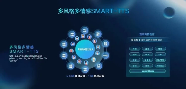 在音频创作方面,多风格多情感语音合成系统SMART-TTS是讯飞研究院此次的重磅技术突破之一。高建清分享了科大讯飞研究院在虚拟声音自动创造和多风格多情感语音合成系统SMART-TTS上的技术进展和成果,抛弃生硬的机器人“口音”,语音合成将变得更加具有“喜怒哀乐”。在此创新下,语音合成从依据真人生成走向语义可控生成,音色、韵律、口音等还可根据自己需要进行控制和调整。