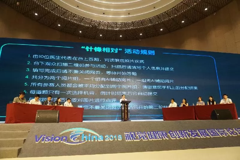 不同于以往单纯的“人机PK”,此次对话提倡“人机合作”理念。参赛一方由顶尖眼底专家,北京大学人民医院赵明威教授带领5位眼底病专业资深医生组成(不使用AI,只用临床经验判断);另一方是由温州医科大学附属眼视光医院陈峰副主任医师带领5位非眼底专业的年轻眼科医生组成的团队,借助Airdoc公司研发的AI人工智能辅助阅片。双方总共进行两轮比赛,第一轮比“准”;第二轮拼“快”。
