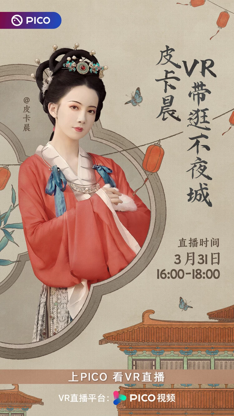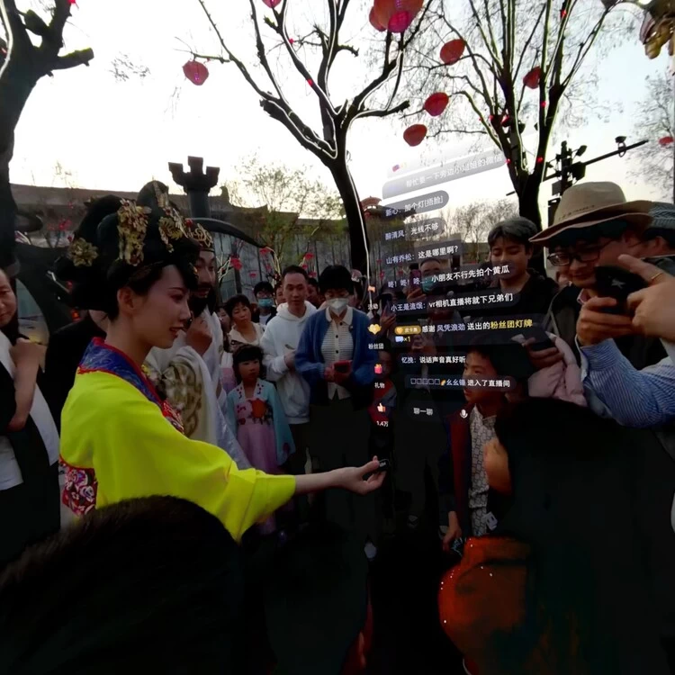 2023年3月31日,PICO 携手大唐不夜城知名红人不倒翁小姐姐“皮卡晨”上线打造VR直播。直播采用了 PICO 和抖音双端VR直播的方式,吸引了大量双端用户的关注与讨论。通过VR第一视角,皮卡晨带着用户游览了大唐不夜城的景区街道,不仅一起品尝了当地特色的美食小吃,与对诗走红的“李白”共同完成了街采拍摄,还在“盛唐密盒”的前排观看了现场表演。VR直播的现场感不仅很好地呈现了大唐不夜城的景区风貌,独有的互动陪伴感也让不少用户纷纷表示这是一场新奇有趣的互动体验。