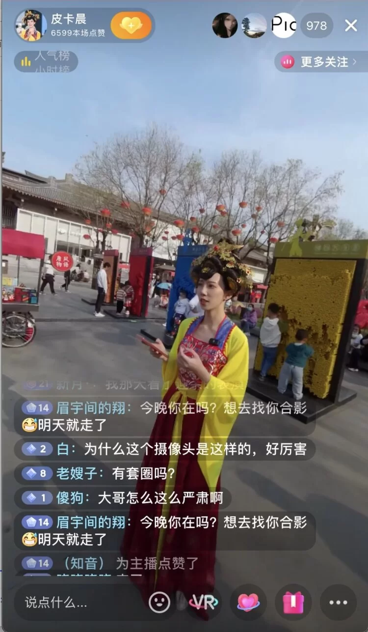 当皮卡晨与大唐不夜城另一位演员李白拜拜开始拍摄“与游客当街对诗”的视频时,VR观众仿佛化身剧组工作人员,全程体验拍摄过程不说,还能将周围环境的小细节尽收眼底。期间会有游客上前与皮卡晨、李白拜拜合影,VR观众不仅能听到游客激动的反应,还能将拍照的路人也看得清清楚楚。