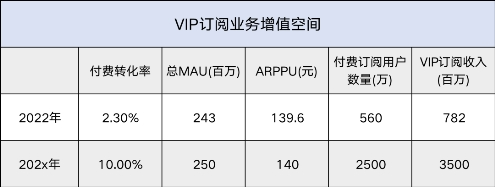以10%的渗透率作为估算,美图的VIP订阅业务收入至少还有超30亿元的增值空间(当付费转化率为10%,在现有基础上假定月活为2.5亿、ARPPU为140元,可得付费订阅用户数为2500万,VIP订阅业务收入为35亿元)。