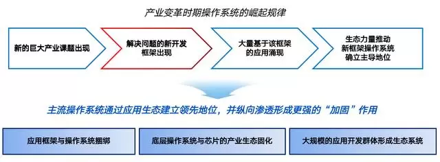 总结历史经验,成功操作系统发展壮大的决定性拐点,是某个解决这个巨大课题的开发框架出现,以及在这个框架上开发的大量应用软件的涌现。如 Windows 系统中的.net 应用开发框架、Android 系统中的 AOSP 应用开发框架通过扮演“承上启下”的支撑角色,对操作系统最终建立生态确立主导地位,起到了更为核心的价值作用。