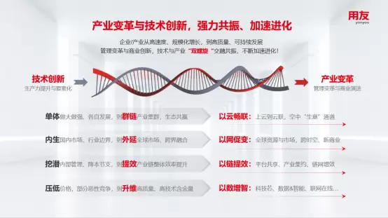 企业/产业从追求高速度、规模化增长,到如今重视高质量、可持续发展管理变革与商业创新,其根本变化在于技术与产业“双螺旋“交融共振,不断加速进化。如今的产业数智化,不仅是关注企业内部管理数智化,更要关注并助力产业发展数智化。